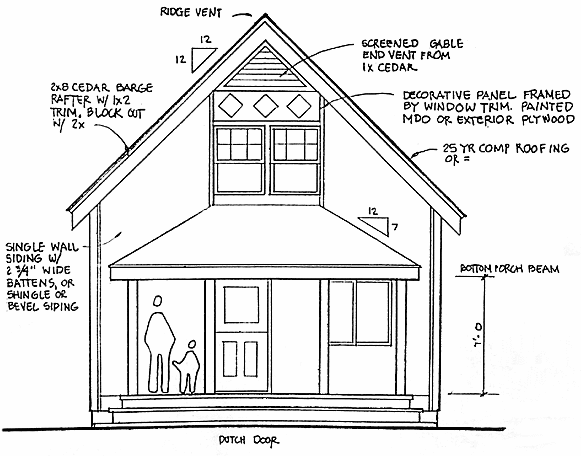 This simple to build classic cottage has between 950 sq. ft. to 875 sq. ft. of living area counting the full sized loft and the 20'x 30' main floor (you have options about the size of the loft). Since all floors and roof bear on the outside walls, the interior of the floor plan can be redesigned to your liking. The framing system is simple and is designed for small crew construction so it can be built by owner-builders. This is one of our most popular plans. The 6-page materials list includes all materials for the post & pier foundation, all framing, hardware, insulation, windows and doors, drywall, electrical, plumbing and interior trim. This list is in Word DOC format (and PDF) so it can be modified and updated as the project progresses.